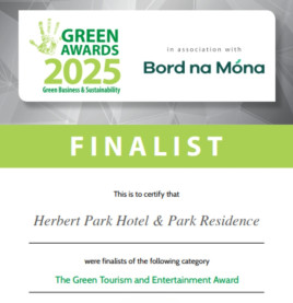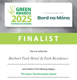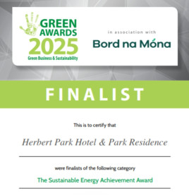 • 100% Clean Energy Certified by Pinergy: Herbert Park Hotel & Park Residence is proud to be certified by Pinergy, ensuring that 100% of the electricity used throughout the hotel comes from clean, renewable sources. This certification reflects our commitment to reducing carbon emissions and supporting Ireland’s transition to a low-carbon future. By powering our operations with green energy, we are making a meaningful contribution to sustainable tourism while continuing to deliver the highest level of comfort and service to our guests.